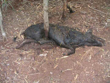The snared pigs die from infection, exposure, strangulation (if caught around their necks), or blood loss from stab wounds.