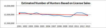 To get a sequence of fairly accurate numbers reflecting hunting participation in recent years I used the number of annual license sales reported by the states to the federal government. The states report their hunting license sales to the federal government every year in order to establish their portion of the distribution of the Pittman-Robertson fund. I started with the license sales for all 50 states from 2001 through 2013. Of course not everybody who buys a license goes hunting in that year. In 2001 and 2006 there were also methodologically consistent publications of The National Survey of Fishing, Hunting, and Wildlife-Associated Recreation. In those years the number of hunters reported were about 85% percent of the license sales. Assuming that the 85% of license sales is a good approximation of the actual number of hunters for that year– I plotted the line curve of hunters from 2001 through 2013. The statistical trend line (in red) shows a clear downward slope.